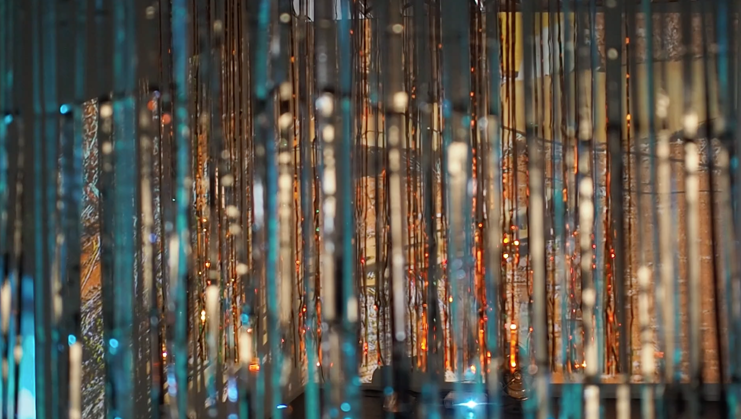 A room in Naarm (Melbourne) is awash with orange and blue light, party tassel curtains hang from the ceiling beams. Four fans push air around the space making the curtains dance and shimmer, agitating the light so that it spreads through the room. Headphones contain the sounds of Pitjantjatjara, Yankunytjatjara and English; stories of pain, loss, strength and resistance. In the corner, a desk invites visitors to play Atomic Mix’n’Match, a twisted game of nuclear universals overlaid on sites affected by the nuclear industrial complex. Seven ceramic balloons lie on the floor, cast in footage from Maralinga and Blade Runner.